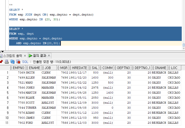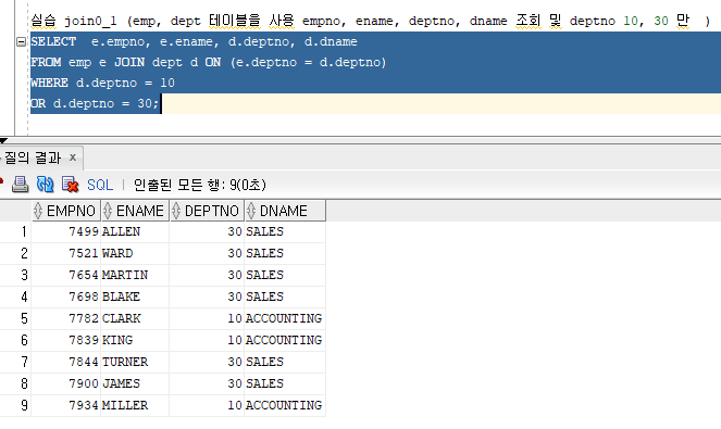 FROM emp e JOIN dept d ON(e.deptno = d.deptno AND e.deptno IN (10,30));