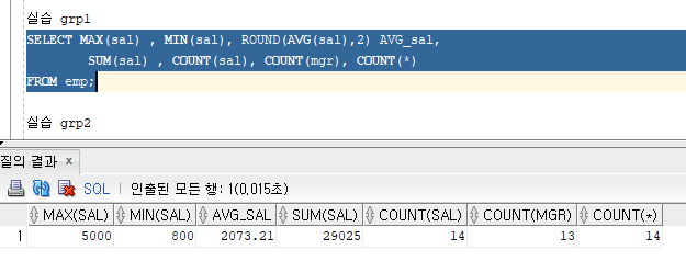 devlunch4 2020. 9. 14. 02:32그룹함수 : 여러개의 행을 입력으로 받아 하나의 행으로 결과를 반환하는 함수