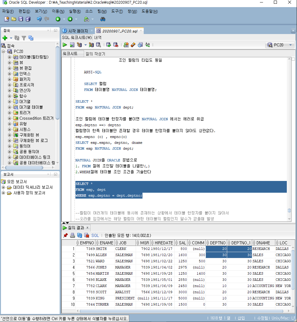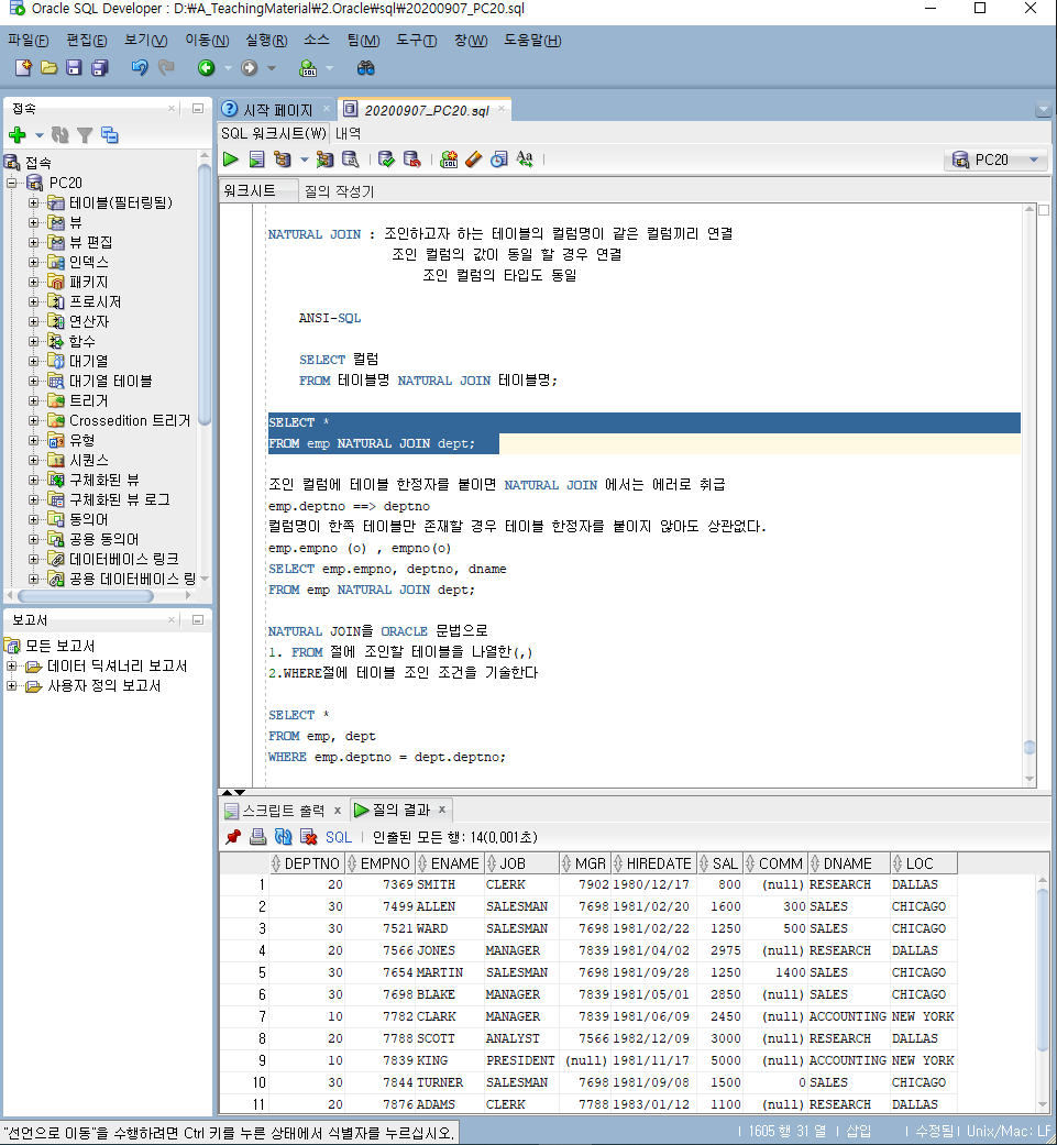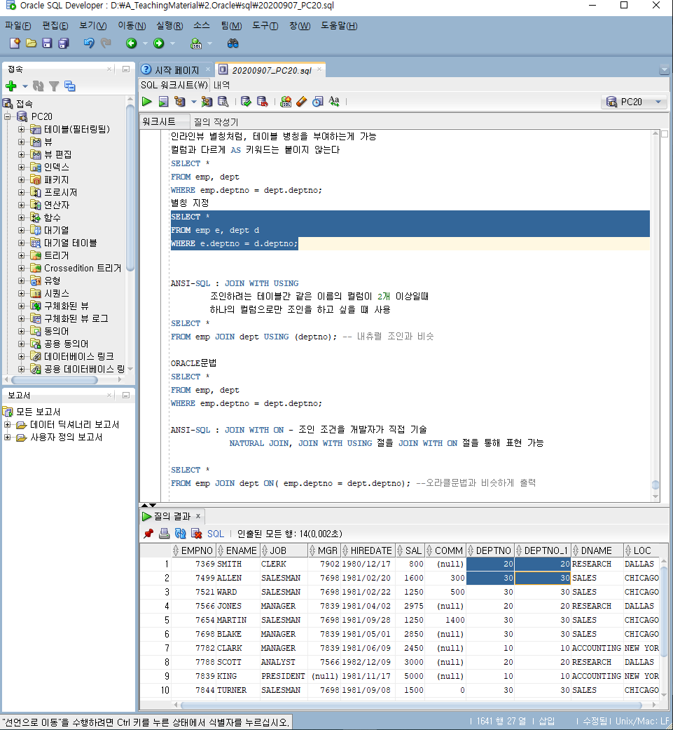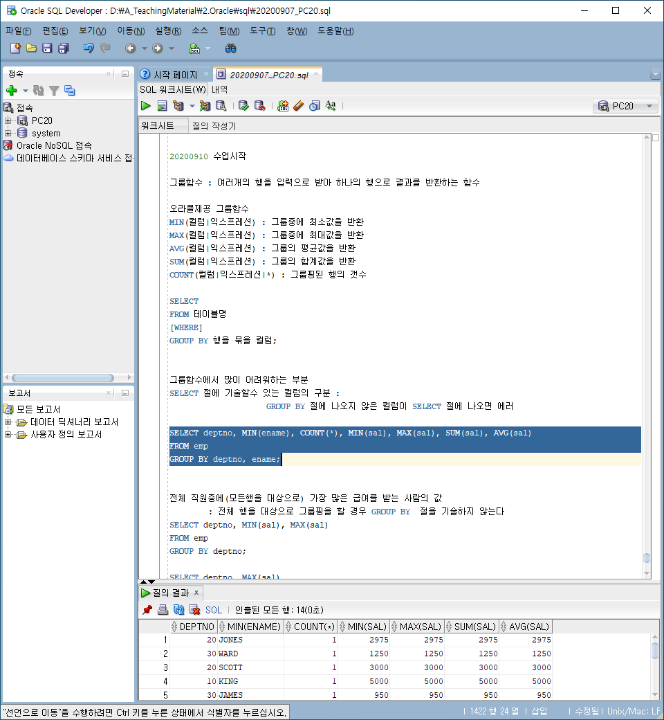 [SQL] 20200910 sql 그룹함수(MIN/MAX/AVG/SUM/COUNT) /HAVING/join/naturaljoin/joinon/nonequijoin/joinusing 본문