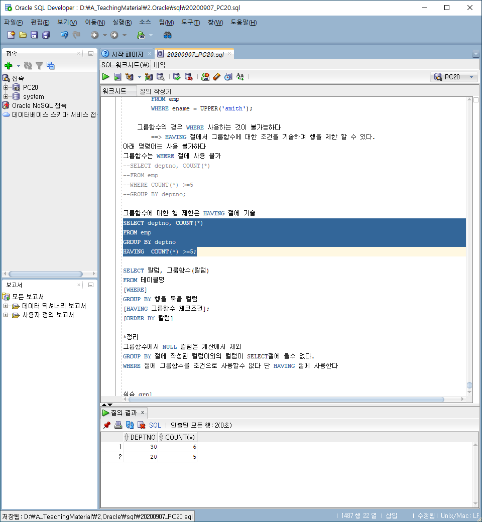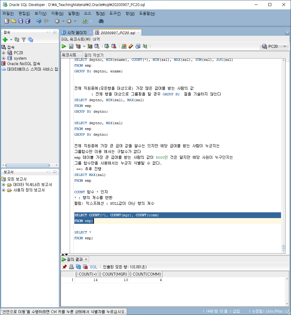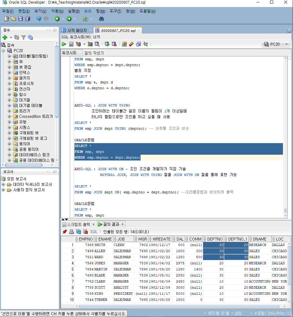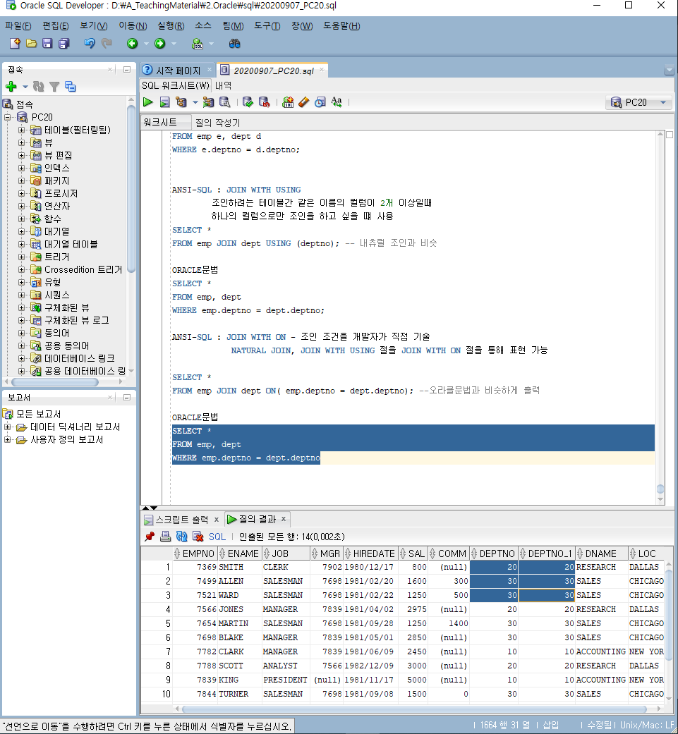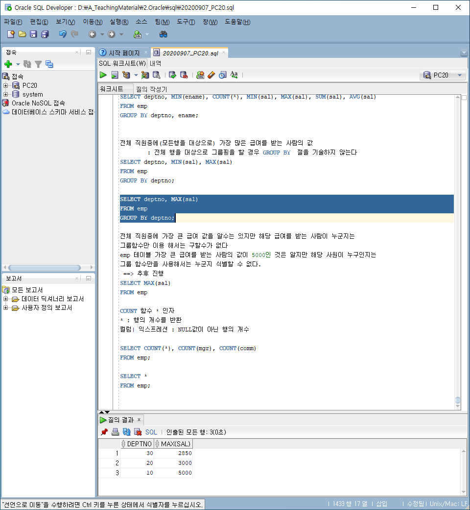 [SQL] 20200910 sql 그룹함수(MIN/MAX/AVG/SUM/COUNT) /HAVING/join/naturaljoin/joinon/nonequijoin/joinusing 본문