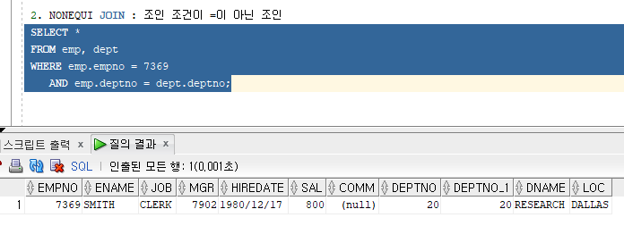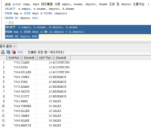 FROM emp e JOIN dept d ON(e.deptno = d.deptno)