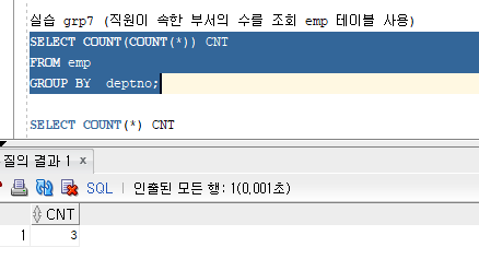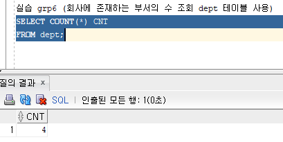 COUNT(컬럼|익스프레션|*) : 그룹핑된 행의 갯수