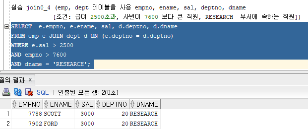 FROM emp e JOIN dept d ON(e.deptno = d.deptno AND e.sal >2500 AND e.empno > 7600 AND d.dname = 'RESEARCH')