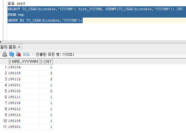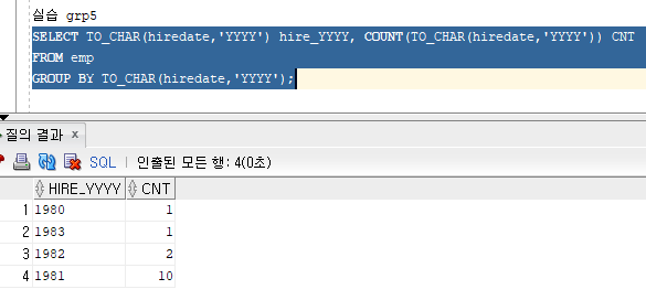 SELECT TO_CHAR(hiredate,'yyyy') HIRE_YYYY, COUNT(hiredate) CNT