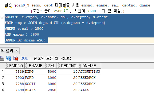 FROM emp e JOIN dept d ON(e.deptno = d.deptno AND e.sal >2500 AND e.empno > 7600)