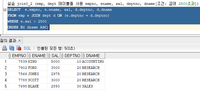 FROM emp e JOIN dept d ON(e.deptno = d.deptno AND e.sal >2500)