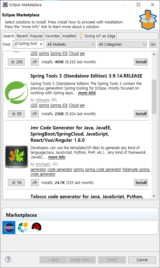 이클립스 > 마켓플레이스 "Spring Tool Suit for 3.7.3"(책에서의 버전) install 그러나 나는 3.9.14로 설치!