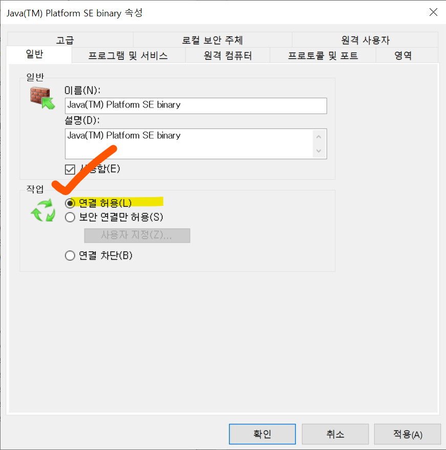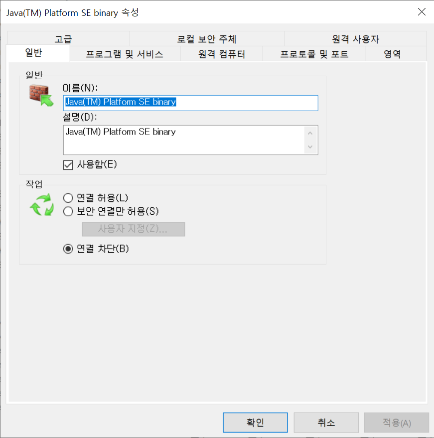 해당 항목의 속성 창에서 일반탭. 그다음 작업 부분을 확인 합니다.