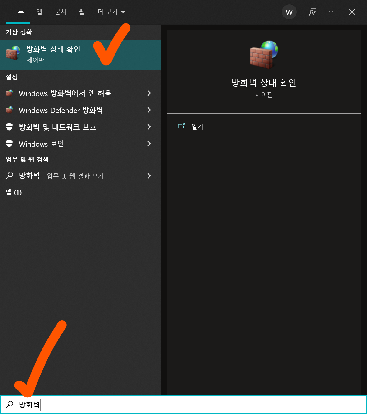 윈도우 검색을 통해 ‘방화벽’ 을 타이핑 후