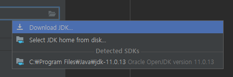 4. 발견된 SDKs 를 선택하거나 기존의 SDK 확인 또는 Download JDK 를 선택하여 설치