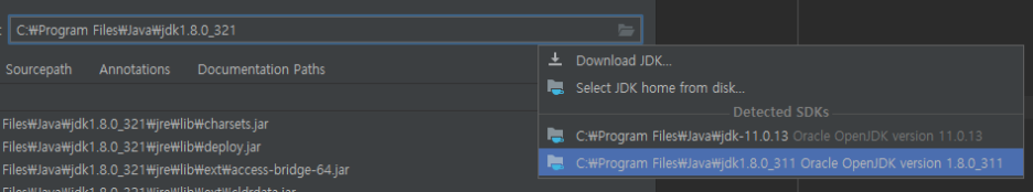 또는 원하는 JDK 설치파일 다운로드 후 설치 그리고 Decteced 한 jdk 선택