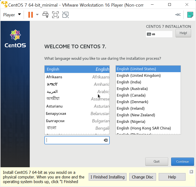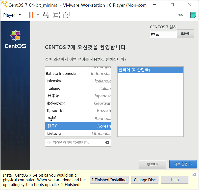 이후 언어설정을 하여 CentOs 설치를 진행합니다.
