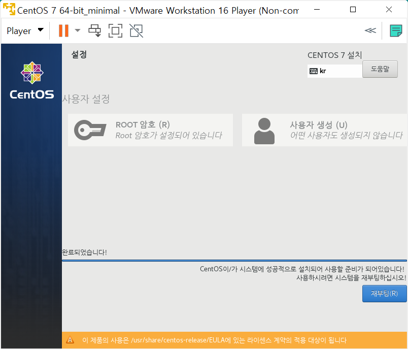 설치가 완료되었고 재부팅 버튼을 클릭합니다.
