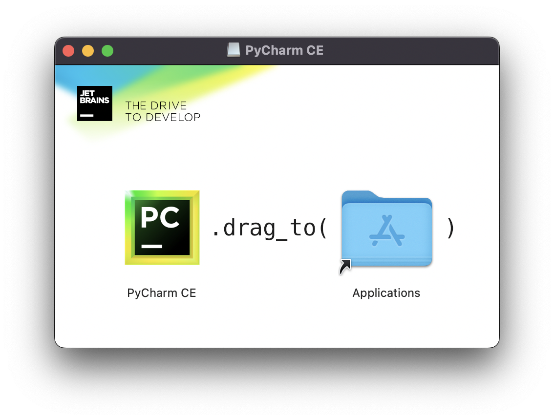 2. 다운로드한 pycharm 설치파일을 실행한다. 그리고 안내(아이콘을 "애플리케이션스"폴더로 드래그)에 따라 설치한다.