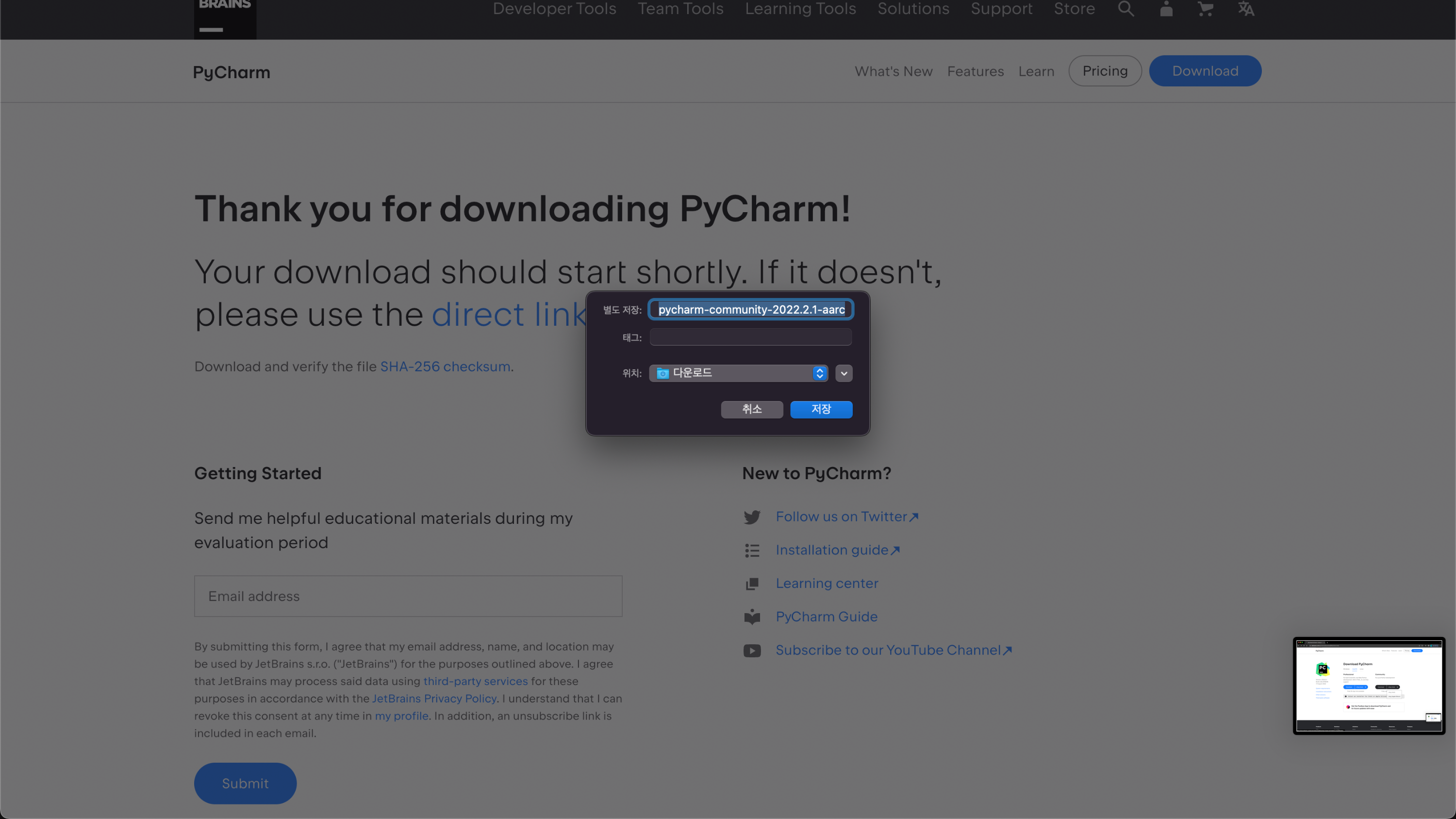 1. 파이참 공식 사이트에 접속하여 본인 PC, OS에 따른 설치 파일을 다운로드 받는다.