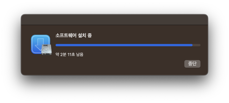 설치 소요시간은 맥의 성능에 따라 다르지만 10~30분 정도 소요되는것 같다.