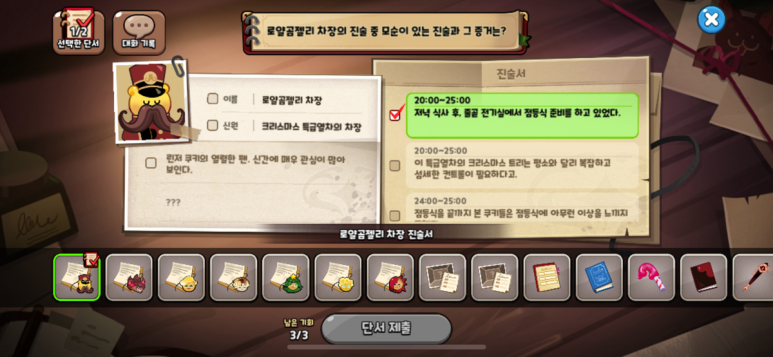 스파클링맛 쿠키맛의 단서를 선택하고 진술서 내용 중 "24:00~25:00 점등식 중간 쯤, 로얄곰젤리 차장이 카트를 미는 소리가 식당으로 가까워지는 것을 들었다."를 선택합니다.