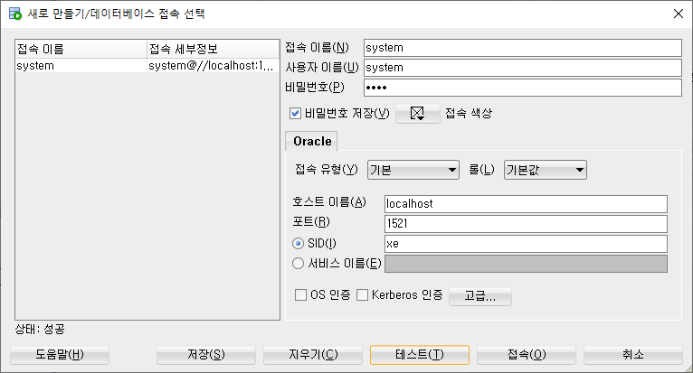>저장>목록에서 생성된 "system" 클릭후 접속