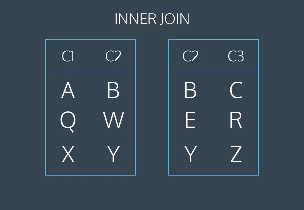 The first and last rows have matching values of c2. The middle rows do not match. The final result has all values from the first and last rows but does not include the non-matching middle row.