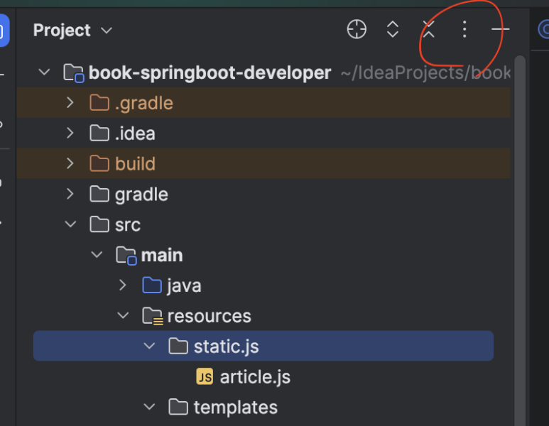 인텔리제이 왼쪽을 프로젝트 폴더 보기 하면 창을 보면 상단에 세로로 된 점 세 개의 아이콘을 볼 수 있습니다.