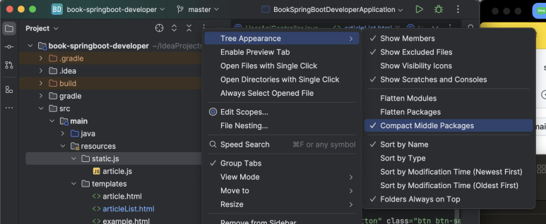 이렇게 인텔리제이 프로젝트 내 폴더와 파일을 볼 때, 패키지 또는 폴더 보기 설정 방법을 변경해 보았습니다.