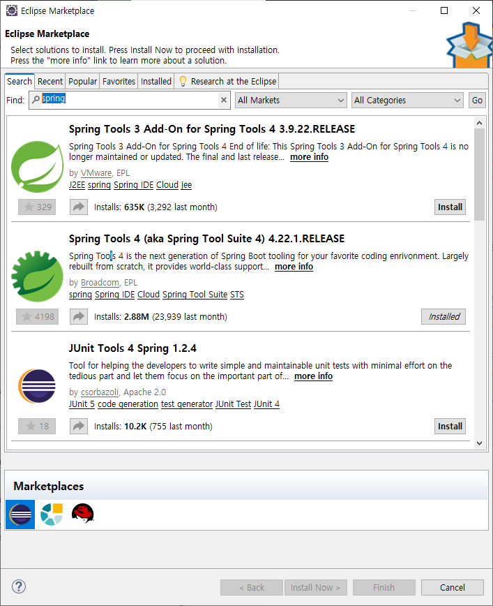 마켓 플레이스에서 spring 을 검색하고 spring tools 4를 설치합니다.
