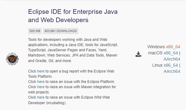 531 MB 62,441 DOWNLOADS Tools for developers working with Java and Web applications, including a Java IDE, tools for JavaScript, TypeScript, JavaServer Pages and Faces, Yaml, Markdown, Web Services, JPA and Data Tools, Maven and Gradle, Git, and more. Clic