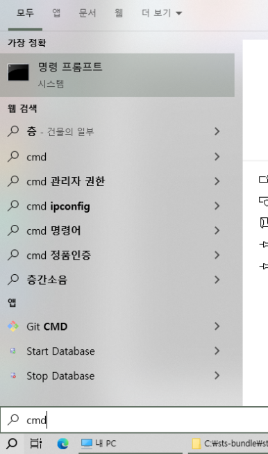 윈도에서 하단 작업표시줄에 돋보기를 누르고 'cmd'를 타이핑합니다.