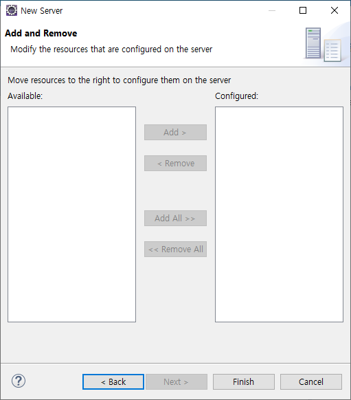 4. 지정 경로 및 설정 및 서버창 등록 목록 확인후 FINISH >>> 이후 적용을 위한 APPLY AND CLOSE 클릭