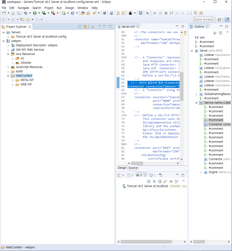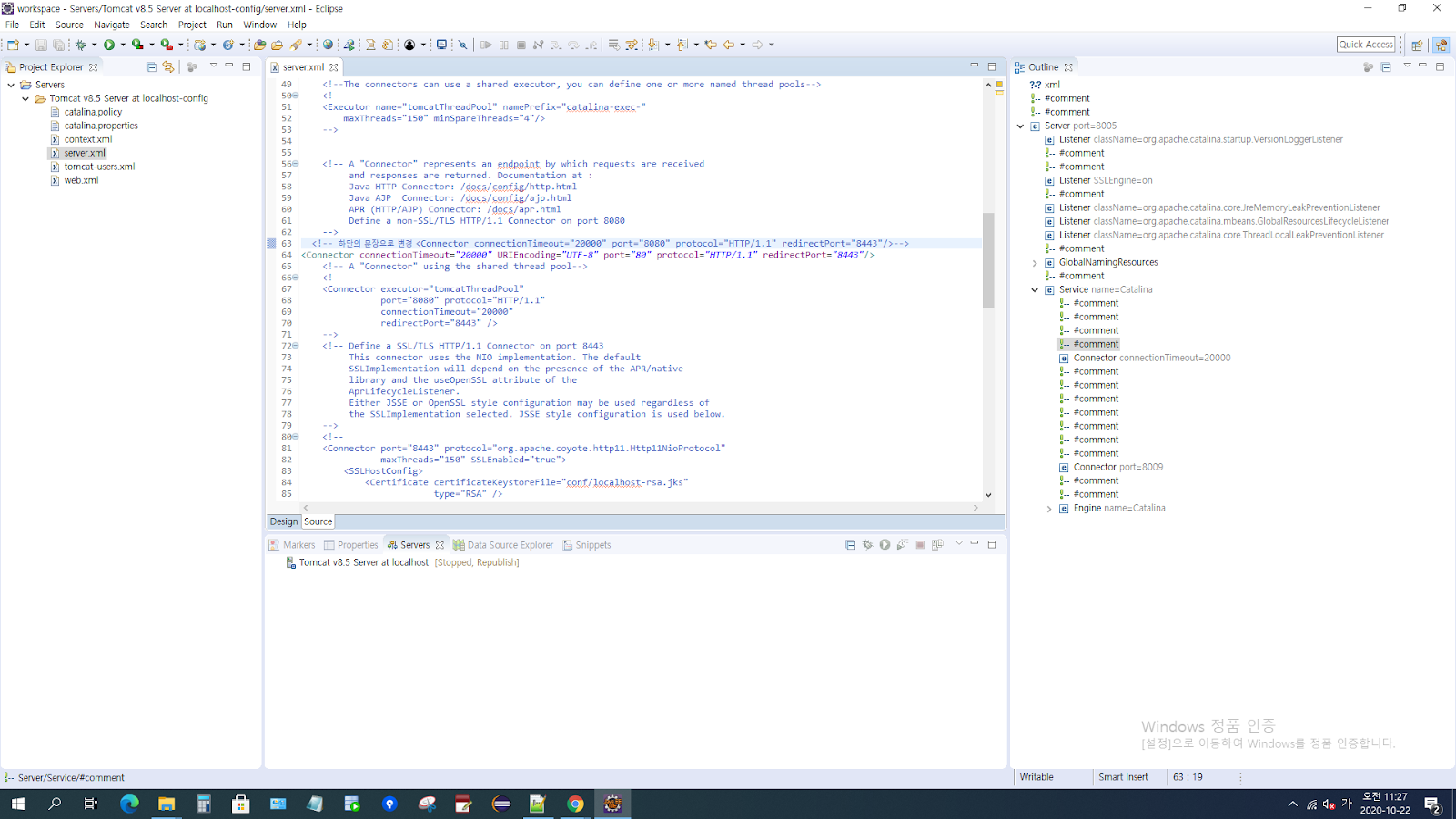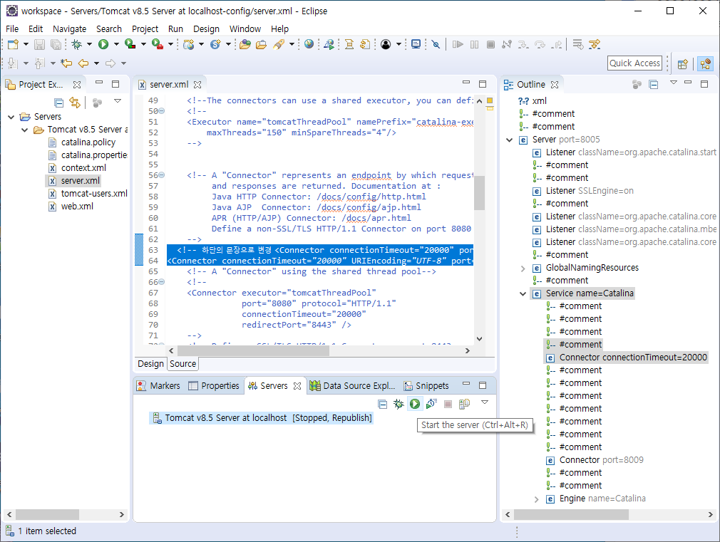 6. 서버 접속을 위한 이클립스 서버포트번호 설정 및 변경(프로젝트익스플로러 >>> server.xml 내용값 수정