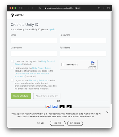 저는 구글 계정으로 연동하여 유니티 계정 생성후 로그인을 하였습니다.