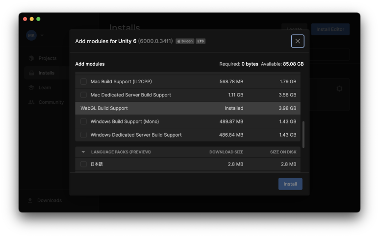 웹버전의 게임 또는 프로그램을 제작하려고 하기 떄문에, WebGL 패키지가 설치 되어야합니다.