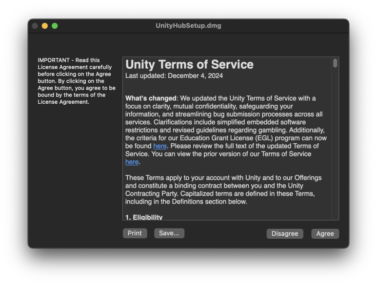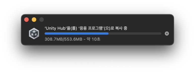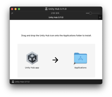 다운받은 UnityHubSetup.dmg 파일을 실행하여 설치를 진행합니다.