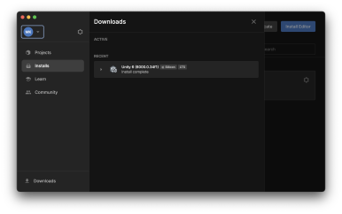 파일 다운로드 및 자동 설치로 유니티 에디터가 설치되었습니다,