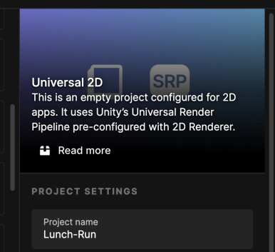 여러 항목 중, Universal 2D를 선택합니다. 그리고 Project name 항목에 본인이 원하는 프로젝트 이름을 입력하고, 저장 경로를 설정합니다.