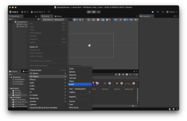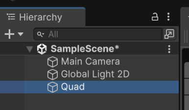 왼쪽 상단의 Hierarchy 창의 빈곳에 오른쪽 클릭을 하고 3D Object > Quad를 선택합니다.