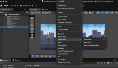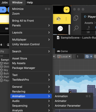 유니티 에디터의 player 객체를 선택하고, 상단 상태 표시줄에서 Window 선택합니다.