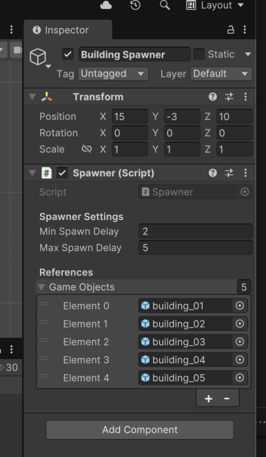 건물을 생성하고, 이어서 빈객체를 생성 및 생성된 빈 객체에 Spawner 컴포넌트를 추가합니다.