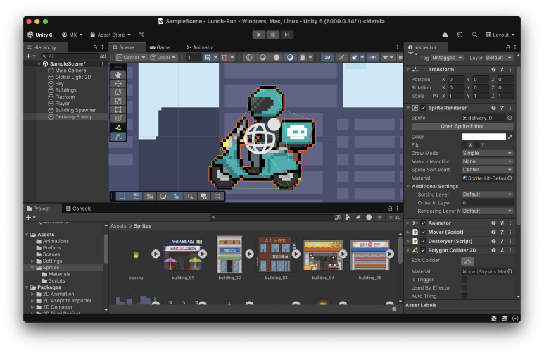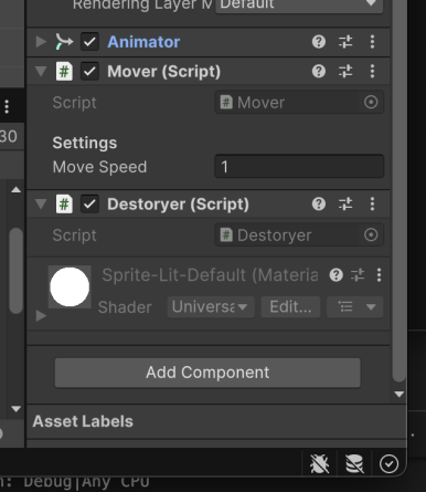 오토바이 애니메이션을 추가하고 Mover, Destoryer의 component를 추가합니다.