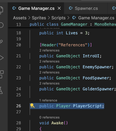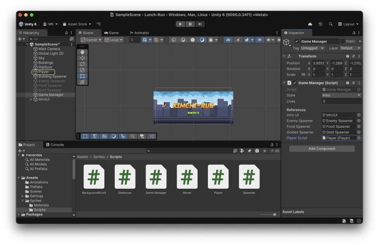 유니티 에디터에서 게임 매니저 컴포넌트에 플레이어 스크립트를 추가해 줘야 합니다.