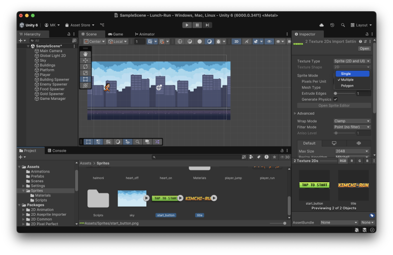 이어서 시착 버튼과 제목 이미지를 선택하고 싱글 sprite 모드로 설정합니다.(아래 스크린샷)