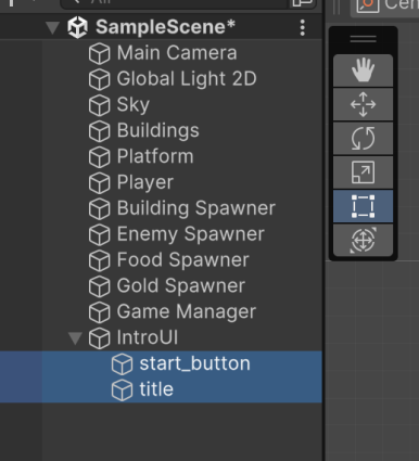 시작 버튼 이미지와 제목 이미지를 IntroUI 오브젝트 객체 안에 드래그하여 넣습니다.