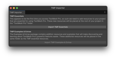 생성하면 팝업 창을 확인하게 되는데요. 'Import TMP Essential' 항목을 선택합니다.