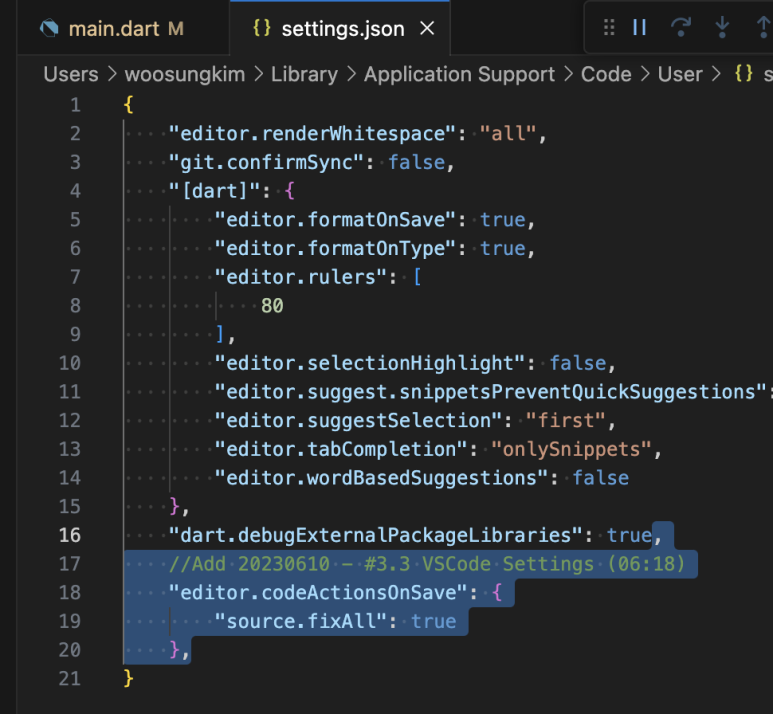 다시 저장(command + s) 하면 자동으로 코드 수정되며 물결줄 문구가 사라집니다.