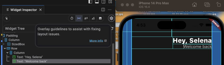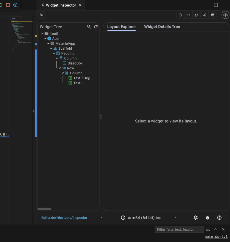 디버그 모드 실행에서 개발자 도구 확인 방법은 아래 디버그 제어창에서 맨 오른쪽 플러터 돋보기를 클릭합니다.
