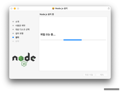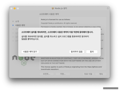 다운로드한 파일 "node-v22.13.0.pkg" 을 실행하고 내용을 확인하며 버튼을 선택하여 설치 진행을 이어갑니다.