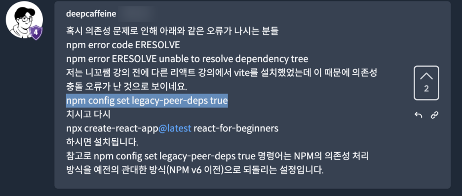 만약 React를 꼭 19.0.0으로 유지해야 한다면, 설치 명령에 --legacy-peer-deps 옵션을 추가하여 강제로 설치를 진행할 수 있습니다.