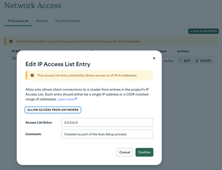 네트워크 접속 ip 접근 권한 어디서나 접근권한으로 변경 및 확인
