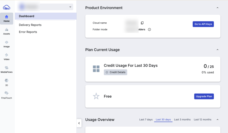 현재 로그인한 계정의 cloudinary에 관한 사항 접근 또는 현황을 볼 수 있습니다.