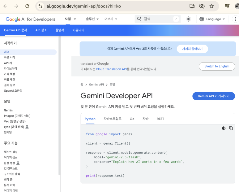 구글 제미나이 api 도큐먼트 링크에 접속합니다.